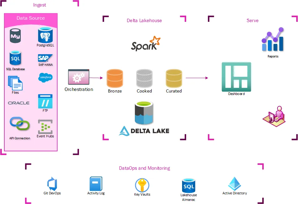 A Data Lakehouse is simply data warehousing principles applied over data in a data lake. Data is exposed through Delta Lake tables, an open-source protocol for interacting with data in the lake in an ACID-compliant way. This comes with several benefits directly applicable to our problems:
