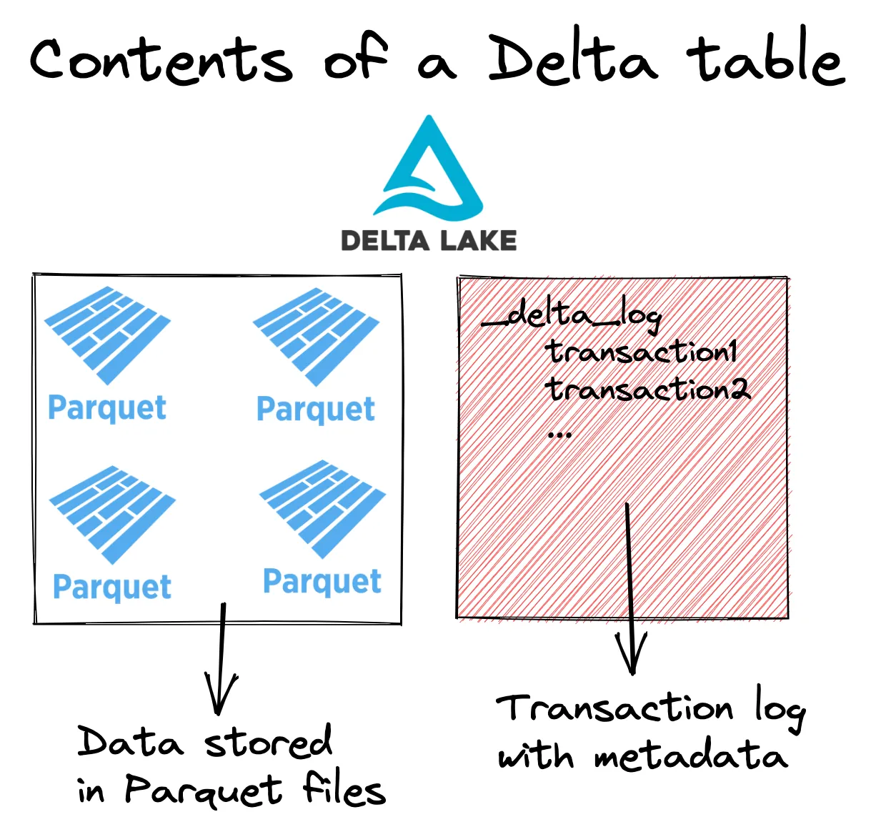 Delta tables consist of data stored in Parquet files and metadata stored in the transaction log.