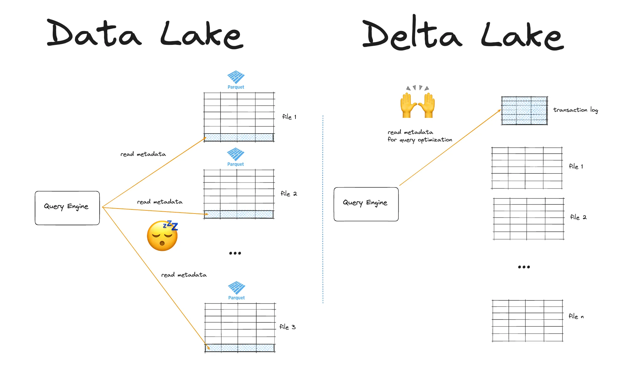 Regular Parquet files store metadata about column values in the footer of each file. This metadata contains min/max values of the columns per row group. This means that when you want to read the metadata of your data lake, you will have to read the metadata from each individual Parquet file. This requires fetching each file and grabbing the footer metadata, which is slow when you have lots of Parquet files.